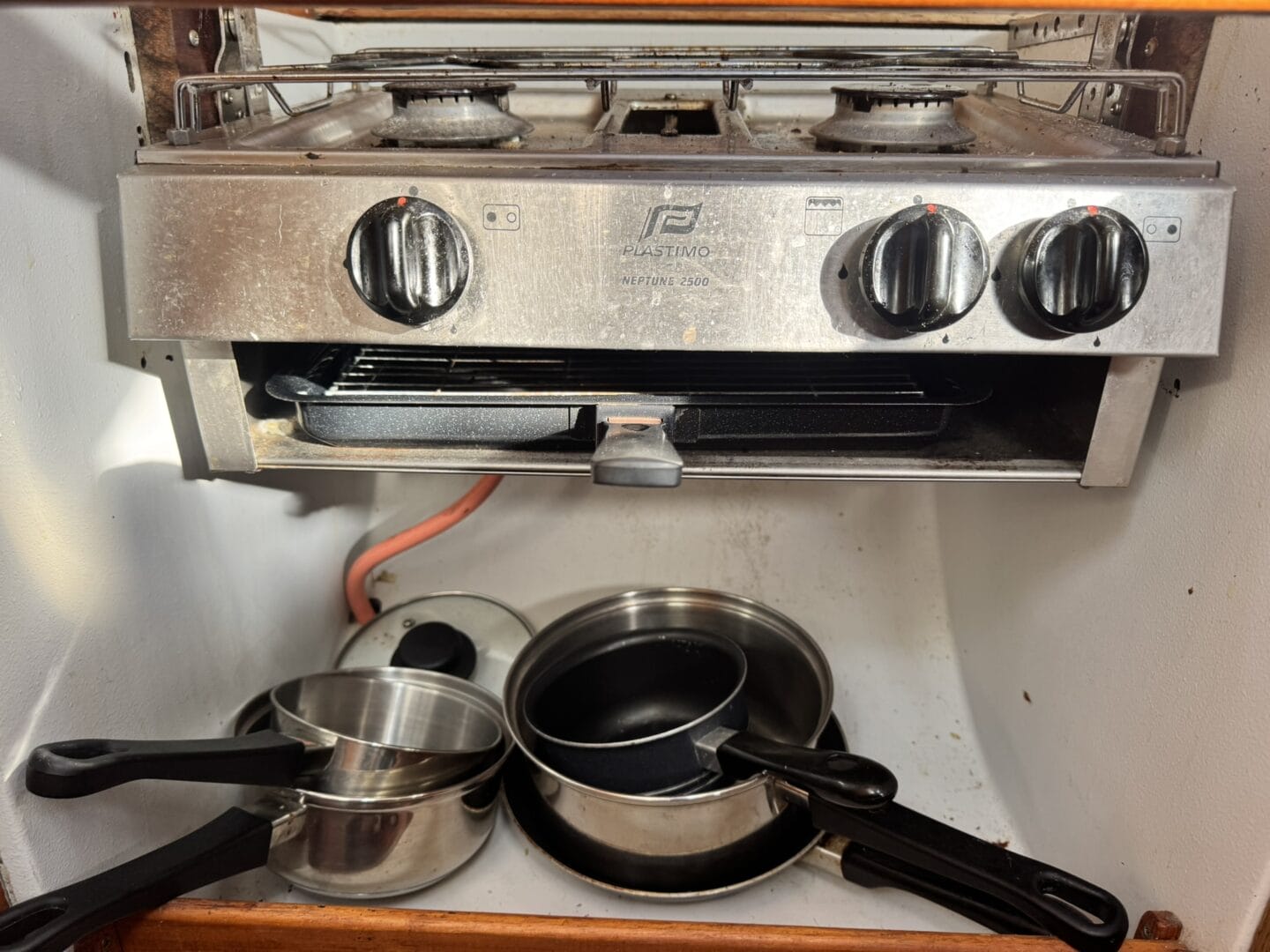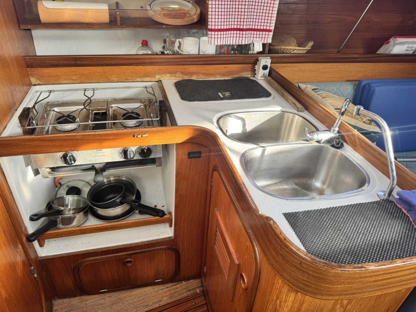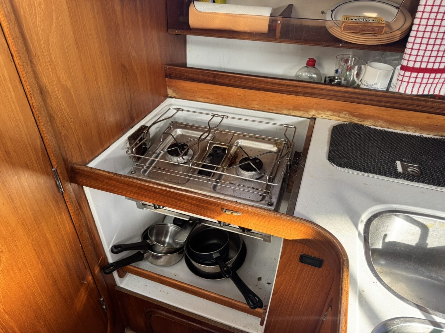 Galley: hot & cold water, double sinks, gas hob, gas grill, refrigerator, cup/bottle storage, cupboard, fire extinguisher