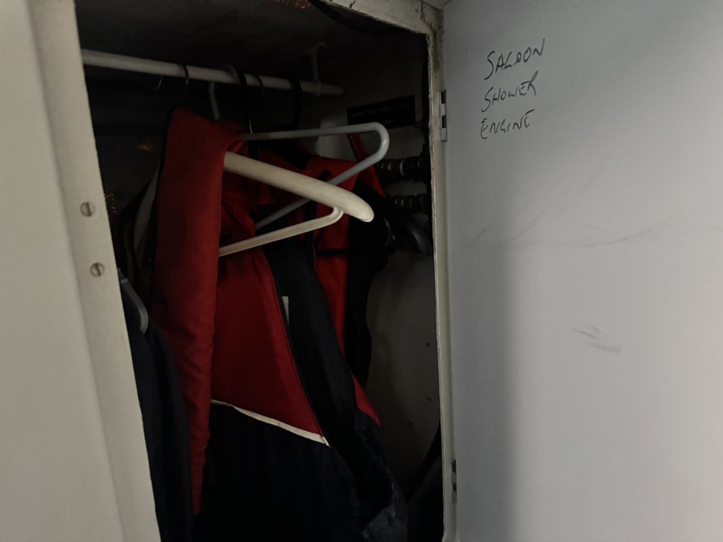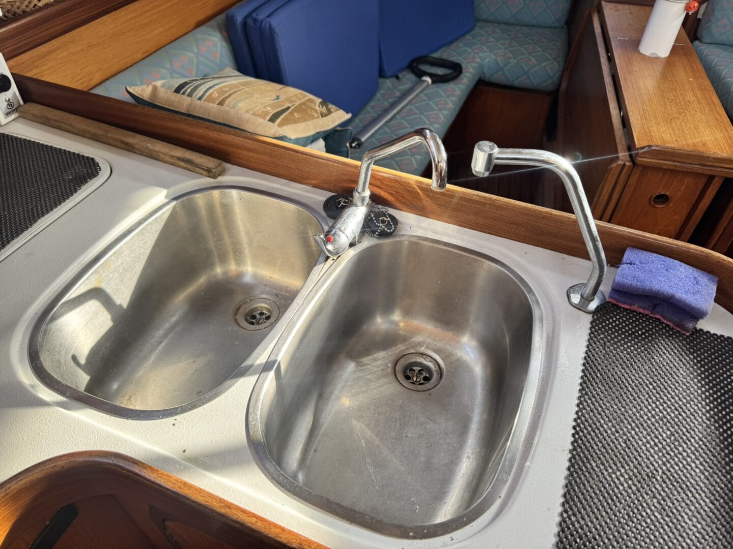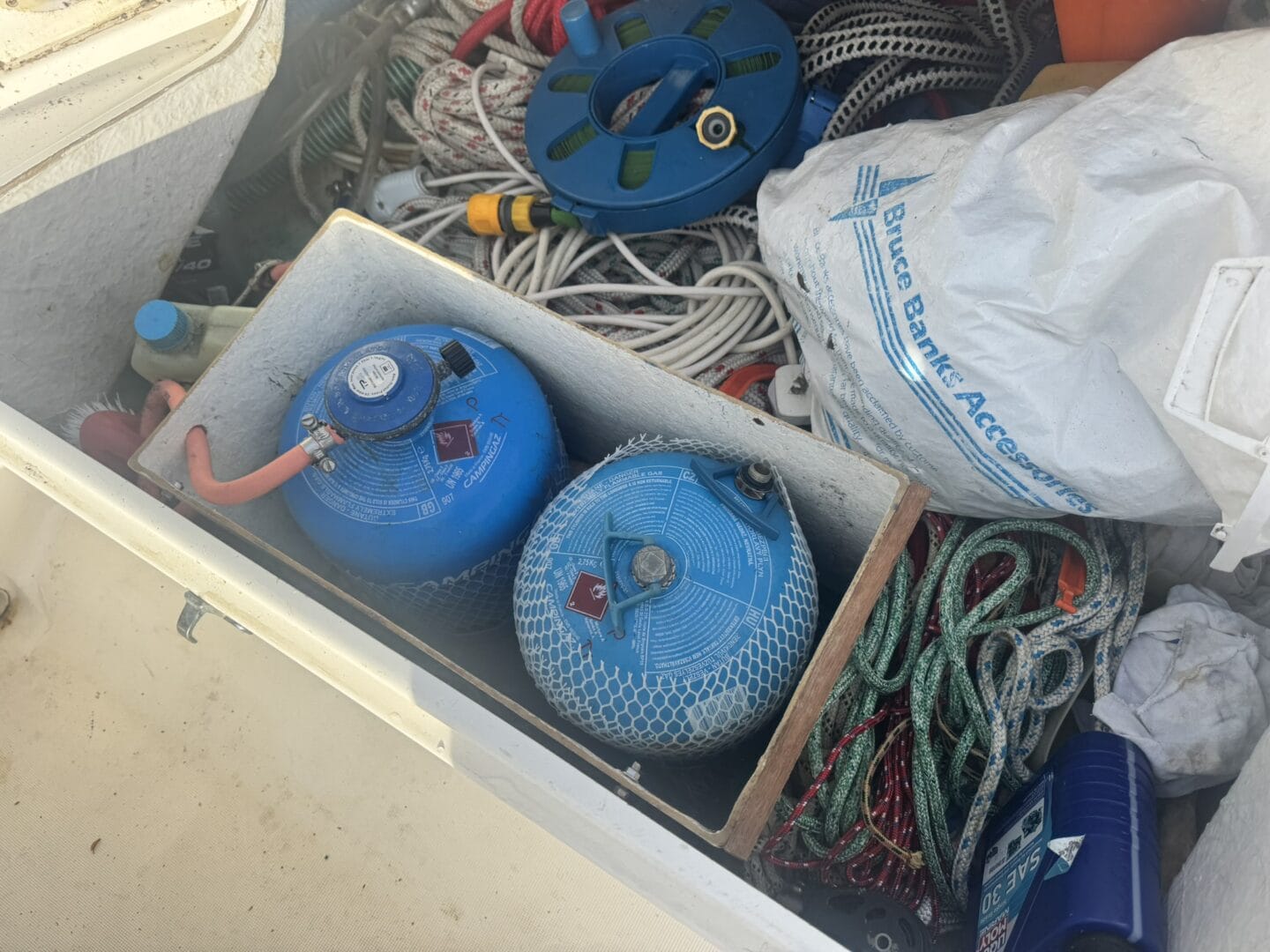 Galley: hot & cold water, double sinks, gas hob, gas grill, refrigerator, cup/bottle storage, cupboard, fire extinguisher