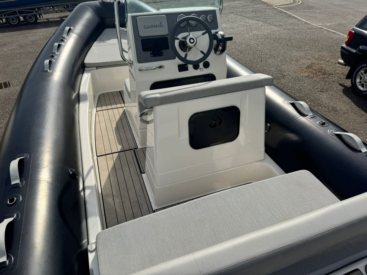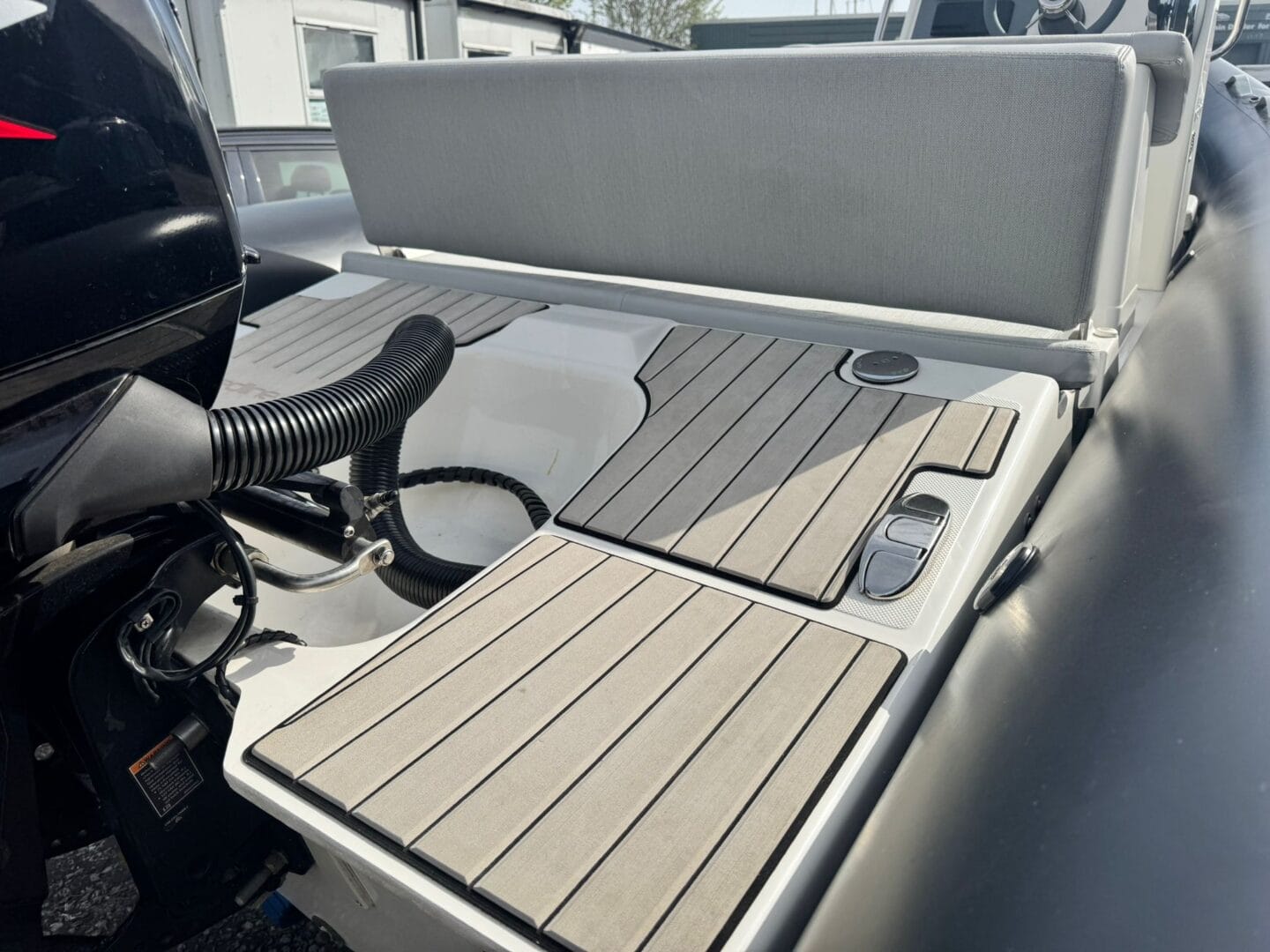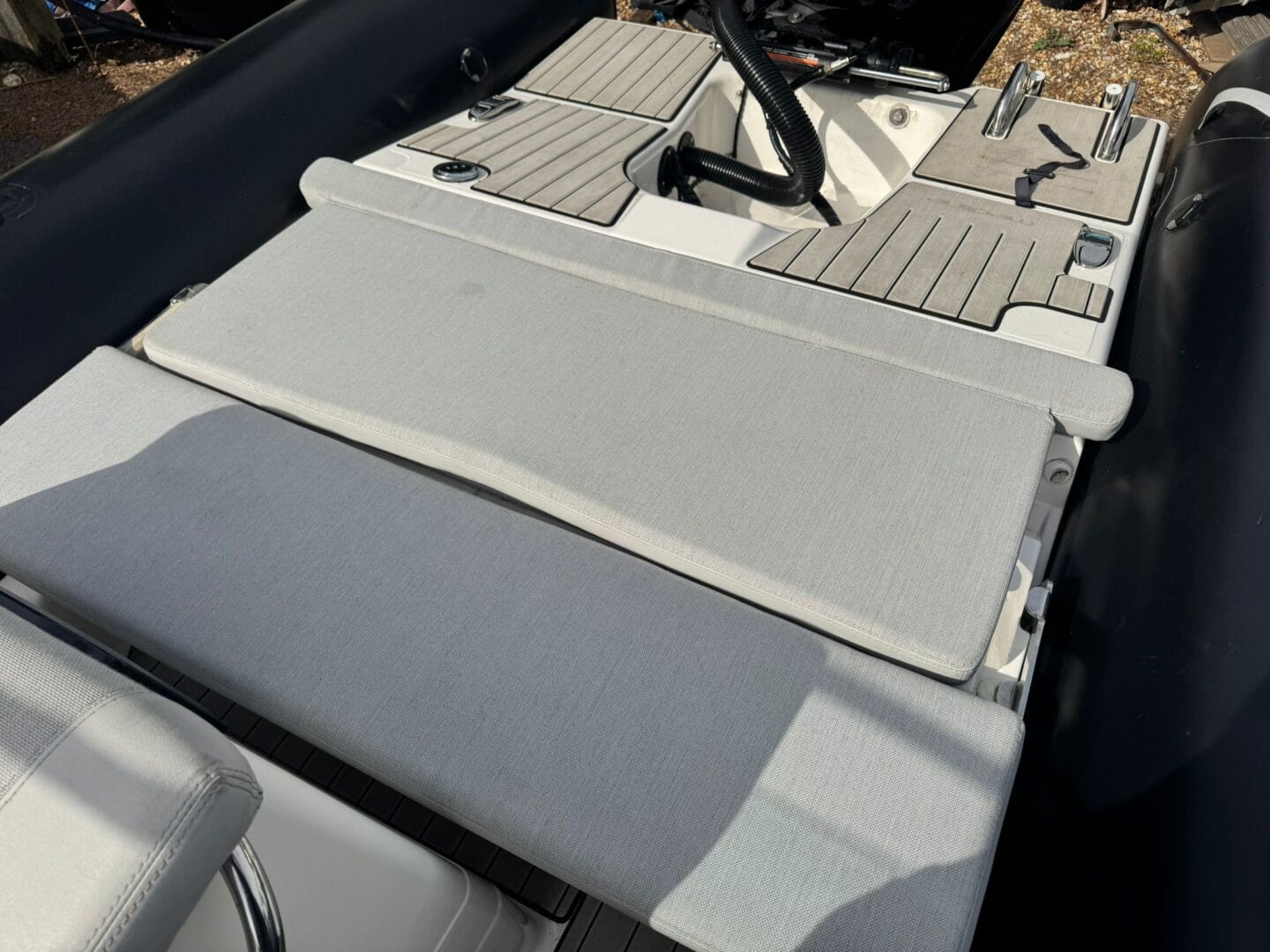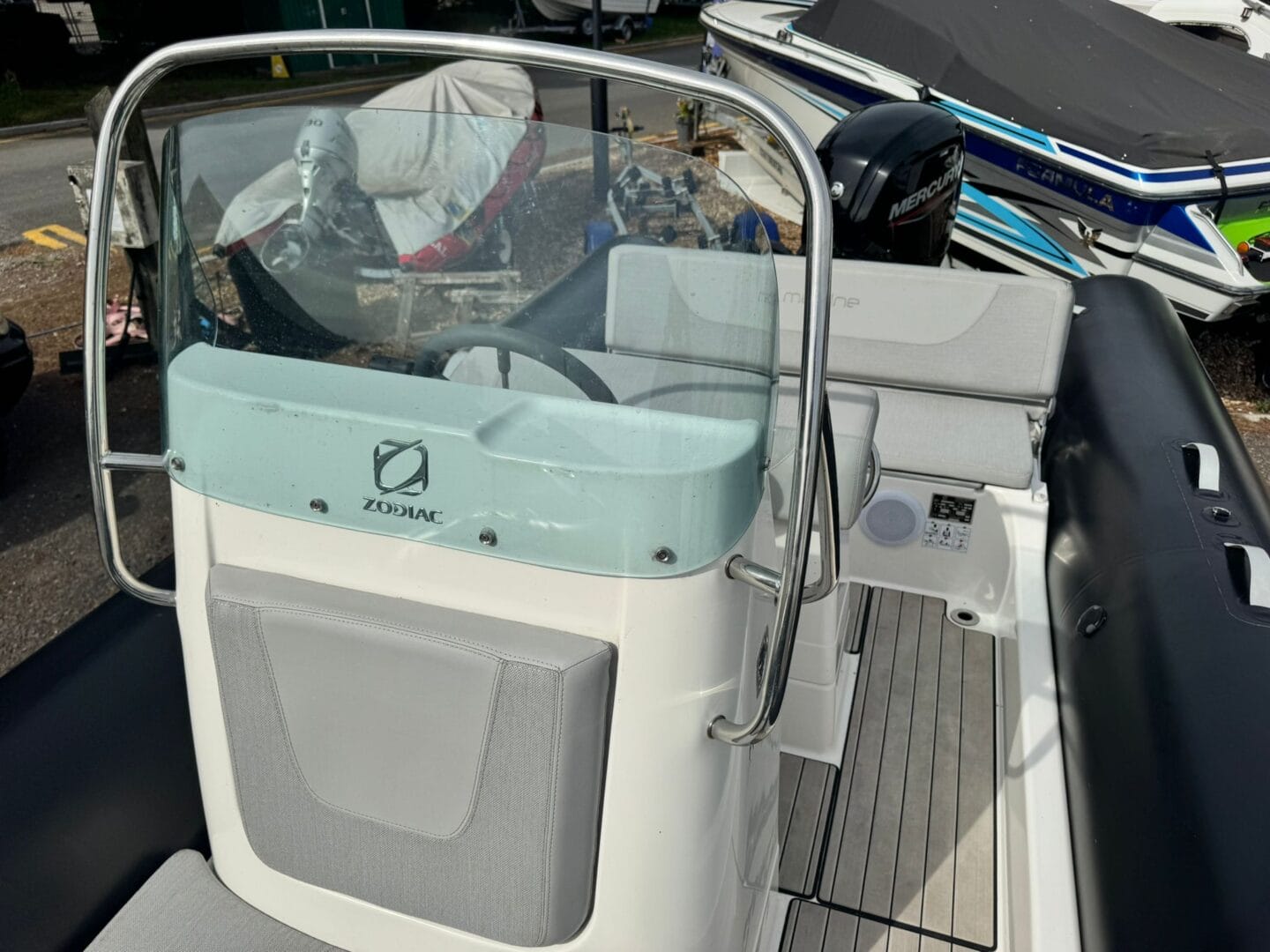With a removable sun pad, bow table, front facing console seat, double helm seat and bench seat at the rear. This Zodiac is the perfect family RIB. And with the EVA foam flooring on the deck, it really makes this RIB look stunning! With the overall cover for the boat to protect it in the typically English weather.