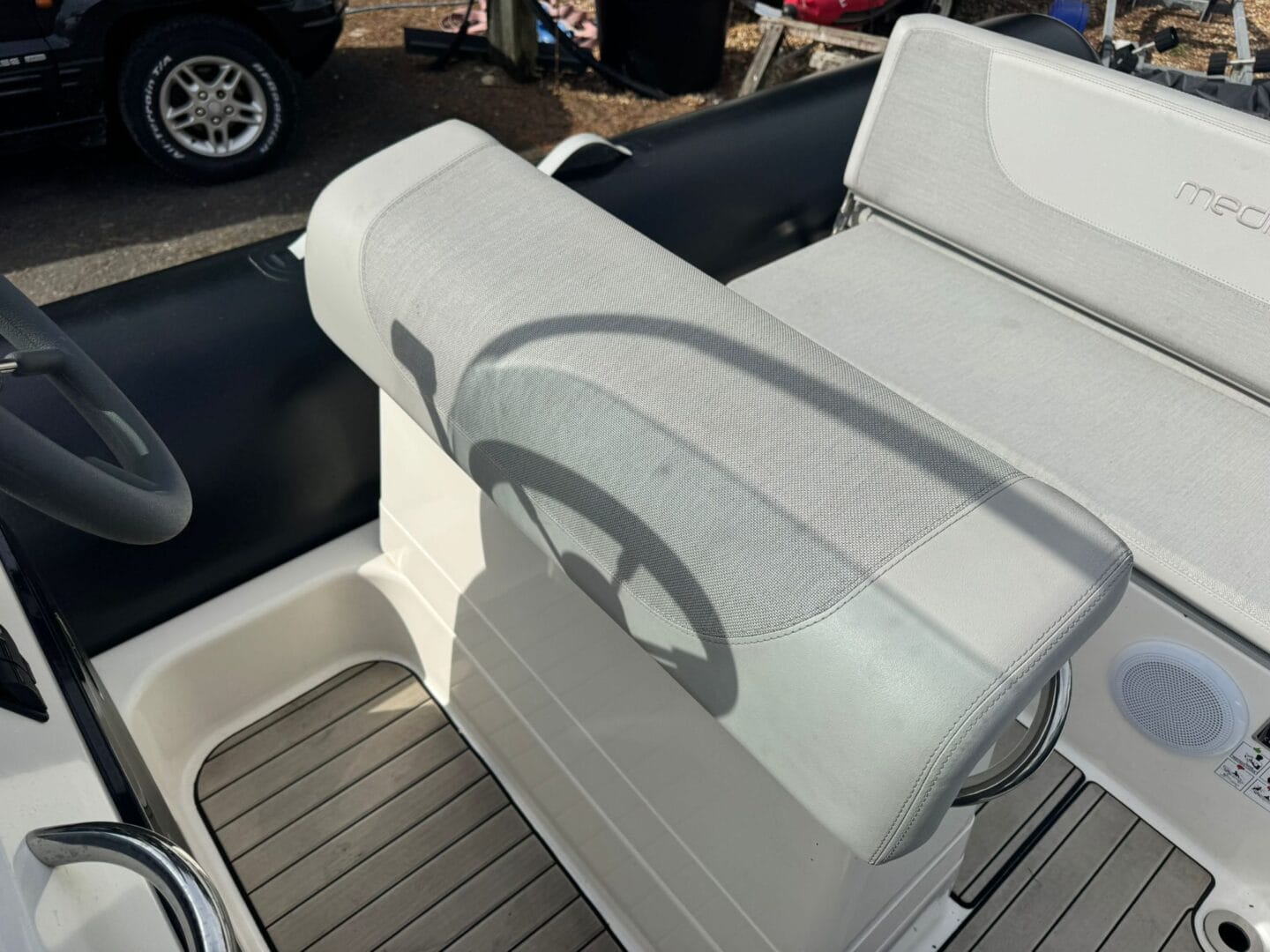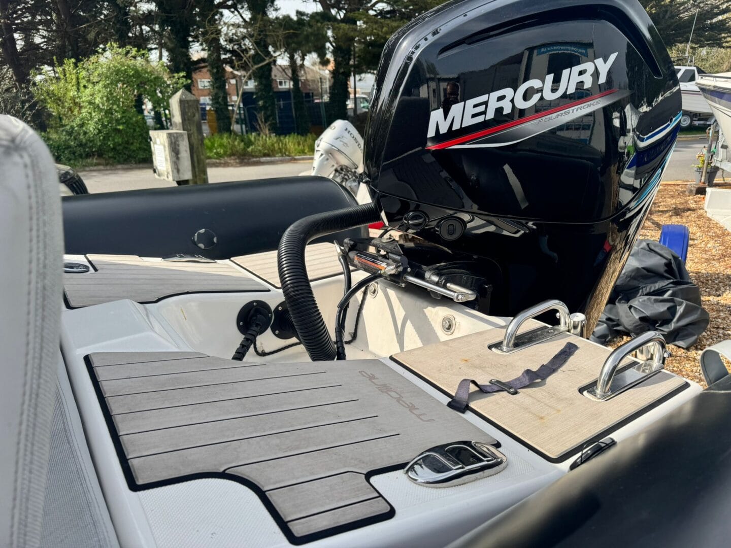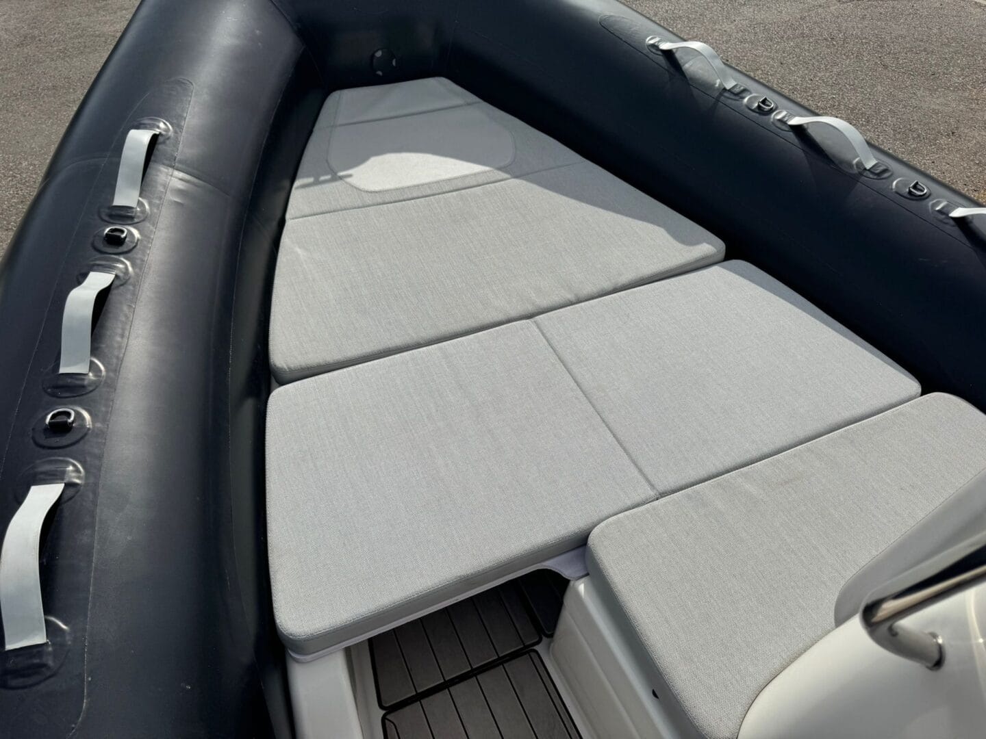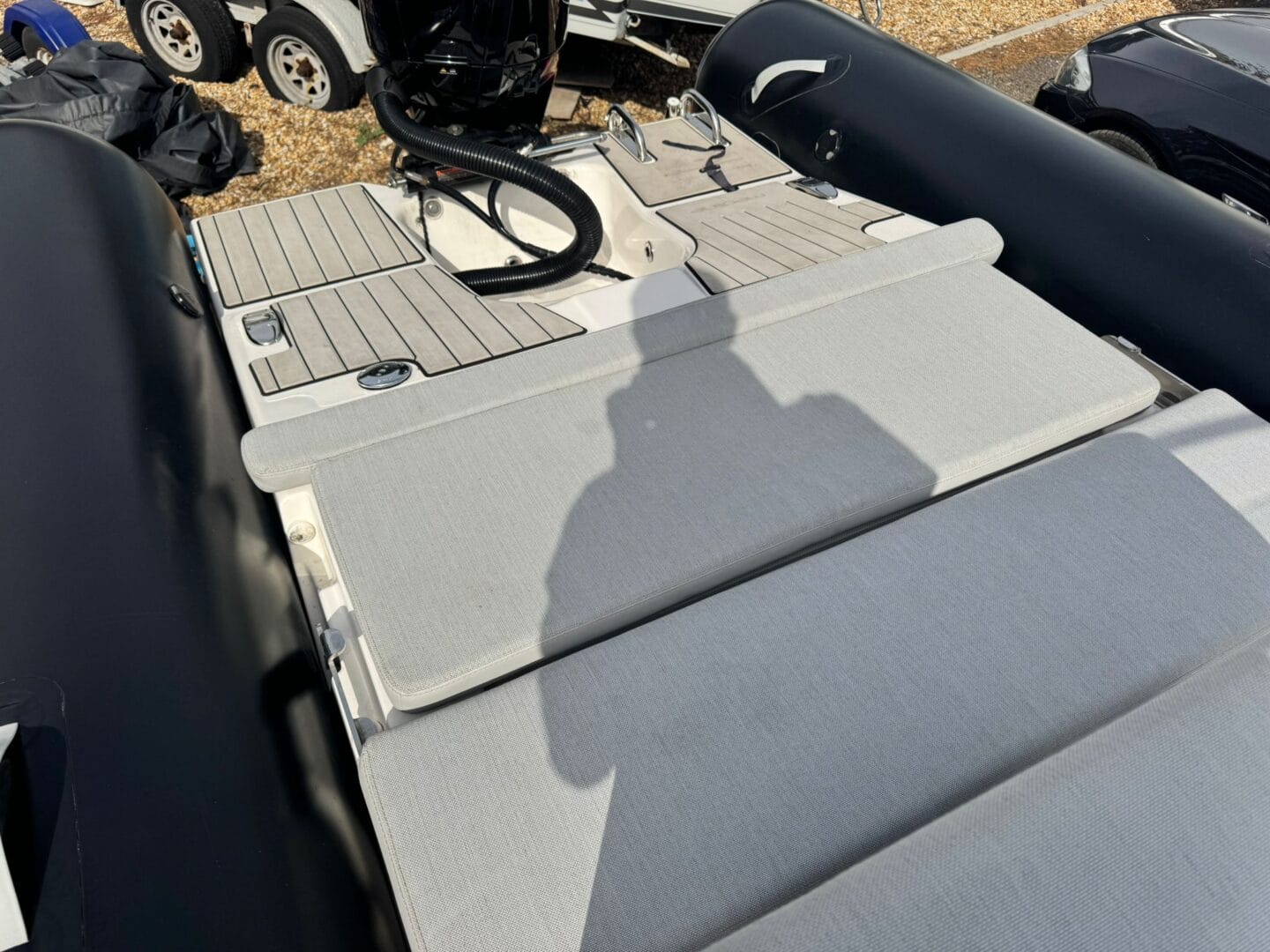 With a removable sun pad, bow table, front facing console seat, double helm seat and bench seat at the rear. This Zodiac is the perfect family RIB. And with the EVA foam flooring on the deck, it really makes this RIB look stunning! With the overall cover for the boat to protect it in the typically English weather.