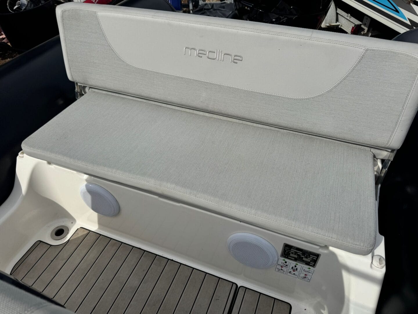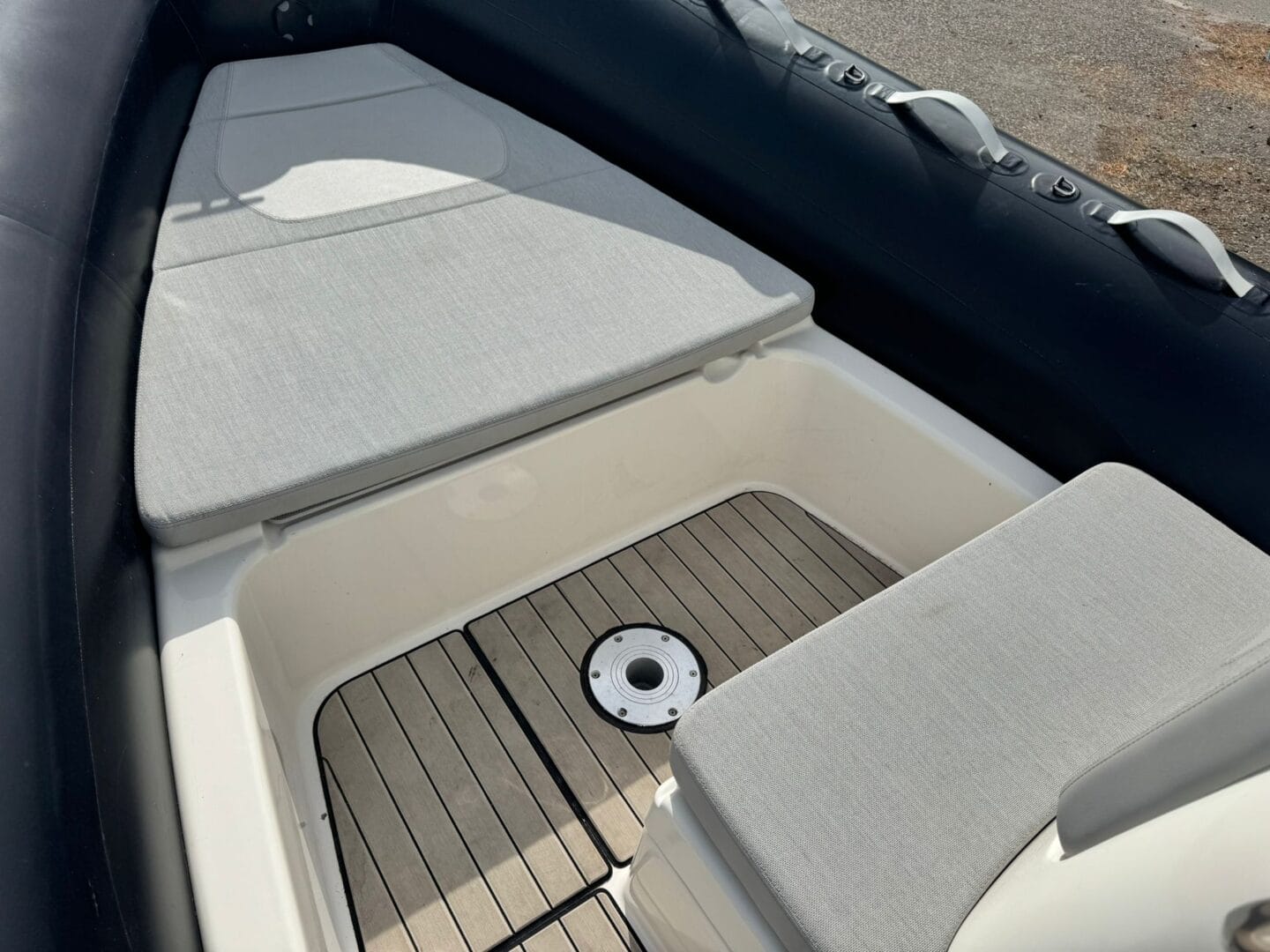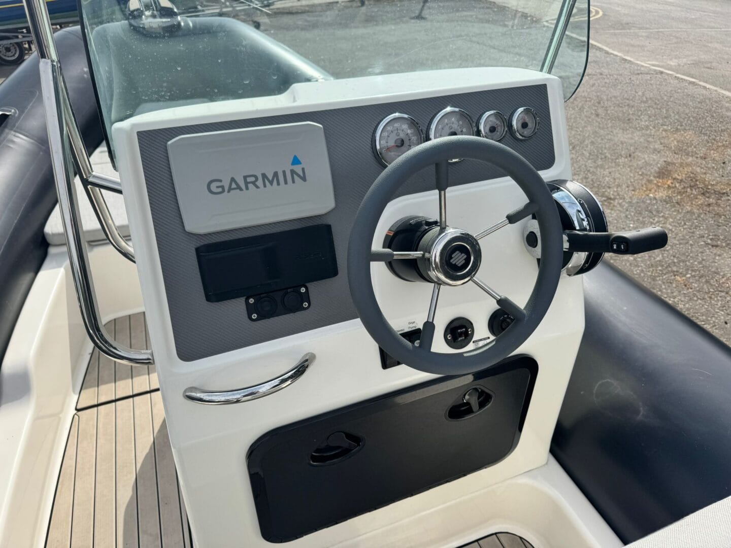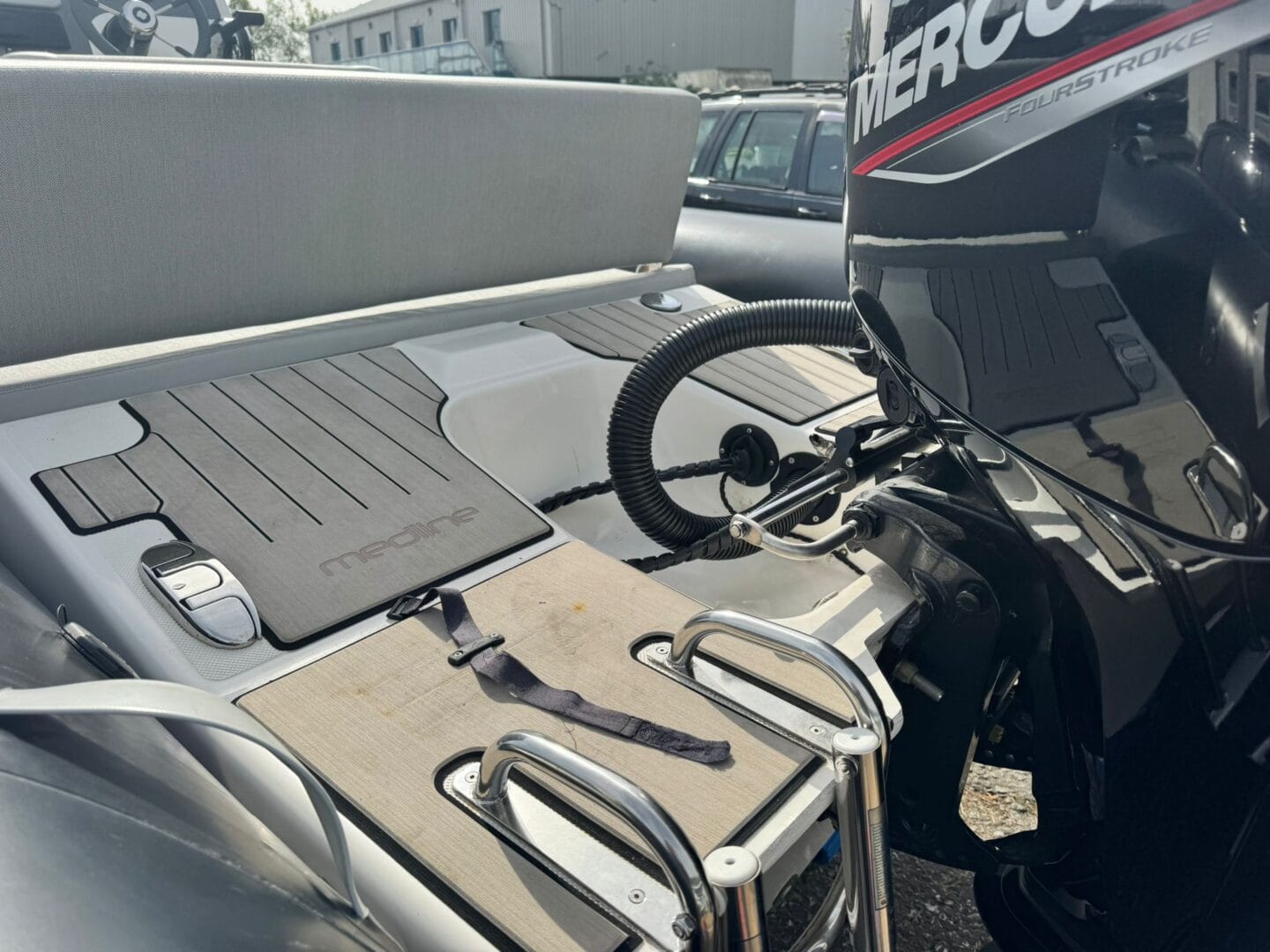With a removable sun pad, bow table, front facing console seat, double helm seat and bench seat at the rear. This Zodiac is the perfect family RIB. And with the EVA foam flooring on the deck, it really makes this RIB look stunning! With the overall cover for the boat to protect it in the typically English weather.